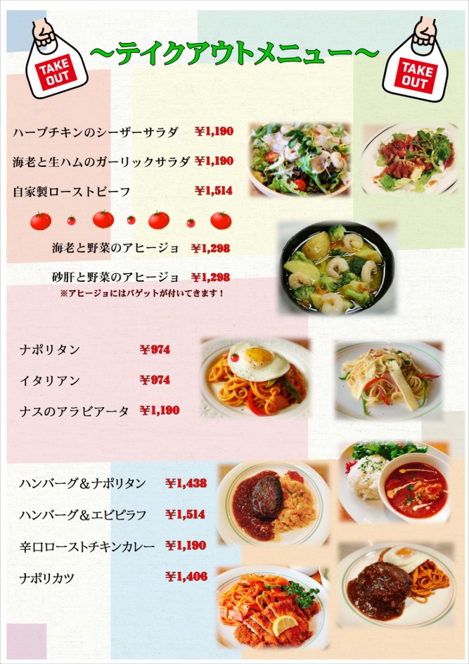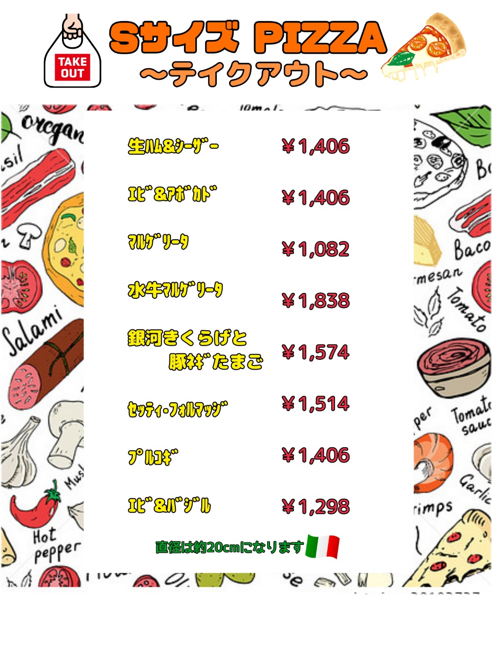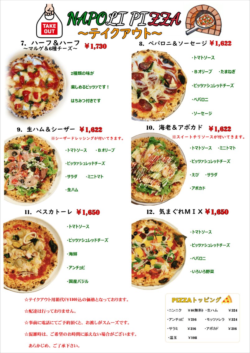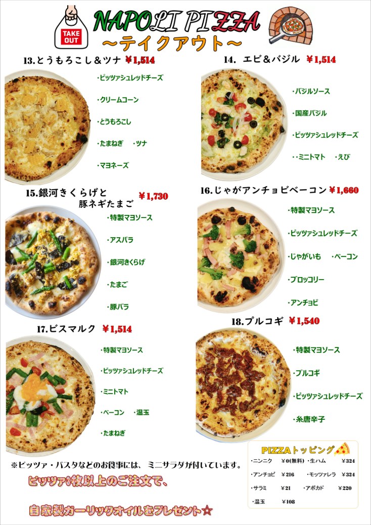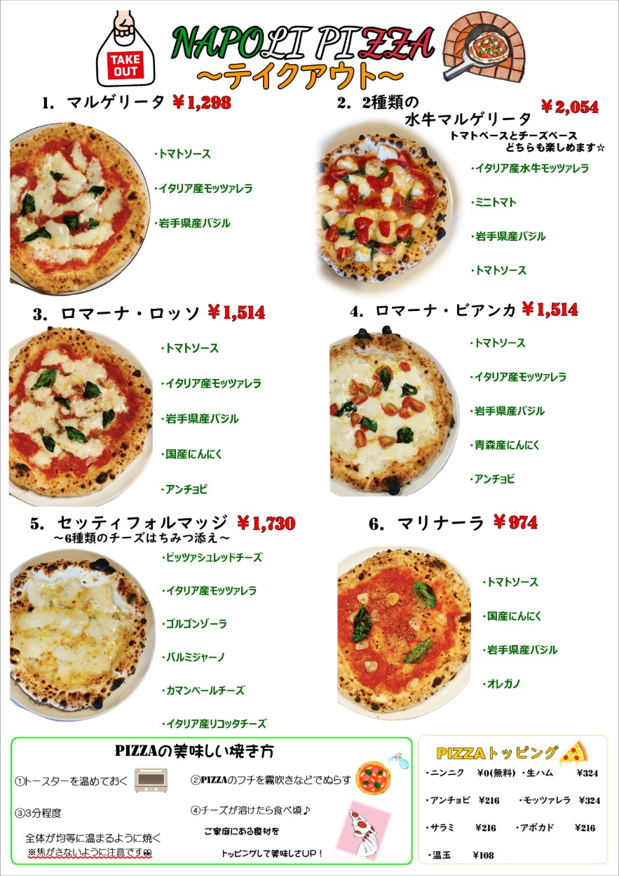 - 当店自慢の本格石窯で焼くナポリピッツァをテイクアウトでお召し上がり下さい。また、アヒージョ、スパゲッティ、ハンバーグセットなど豊富なメニューをご用意しております